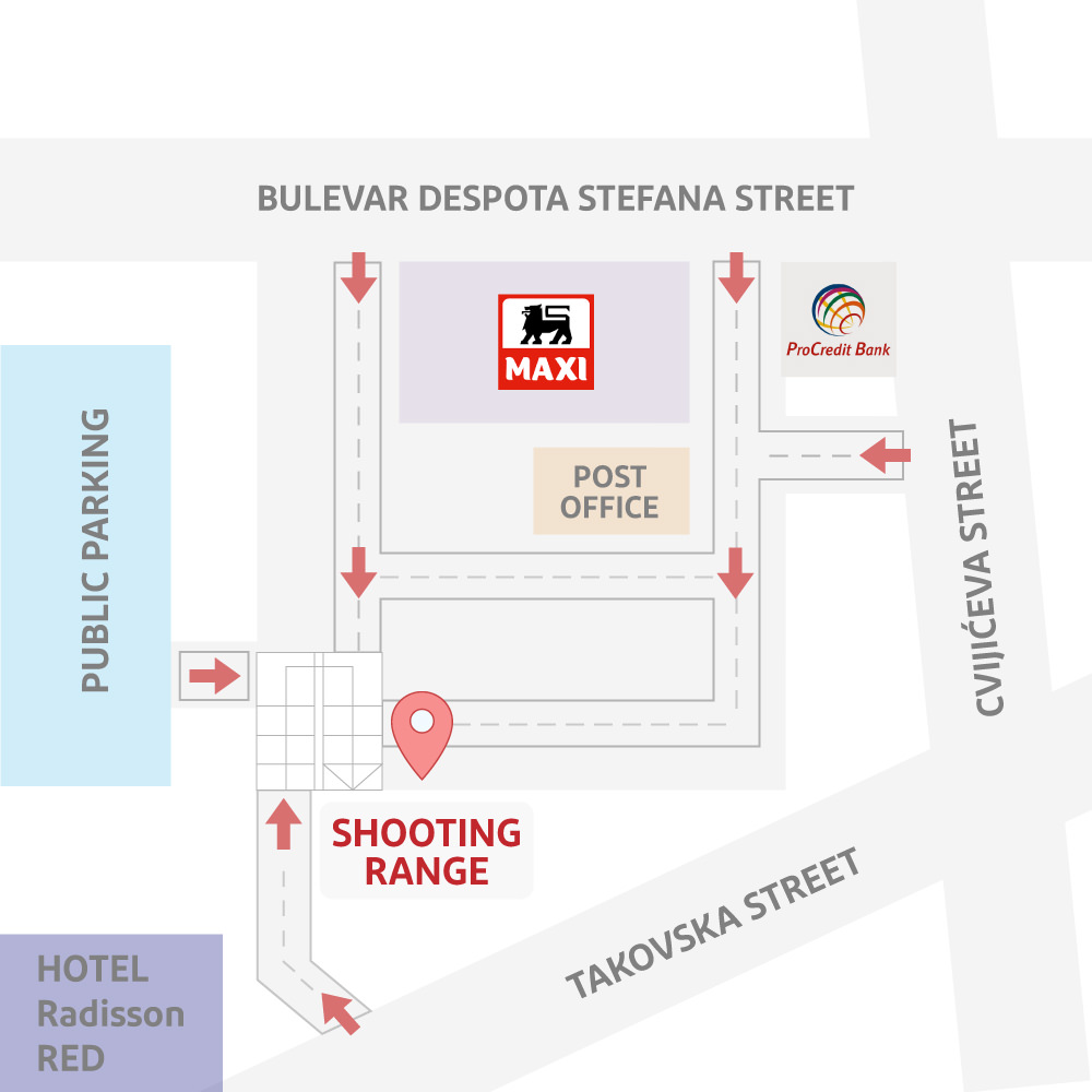 The shooting range is located behind Maxi shop, 70m from the main street and is located on the ground floor. Just follow the sign for Streljana Barutana.